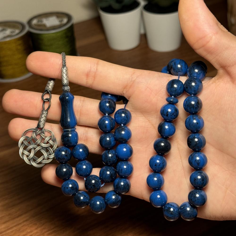 مسباح بكلايت تركي لون أزرق مموج متوسط الوزن مصممة للاستخدام اليومي، تتميز بتصميم مريح وأنيق، عليها طربزونه فضه مما يعطي السبحة جمال وفخامة.